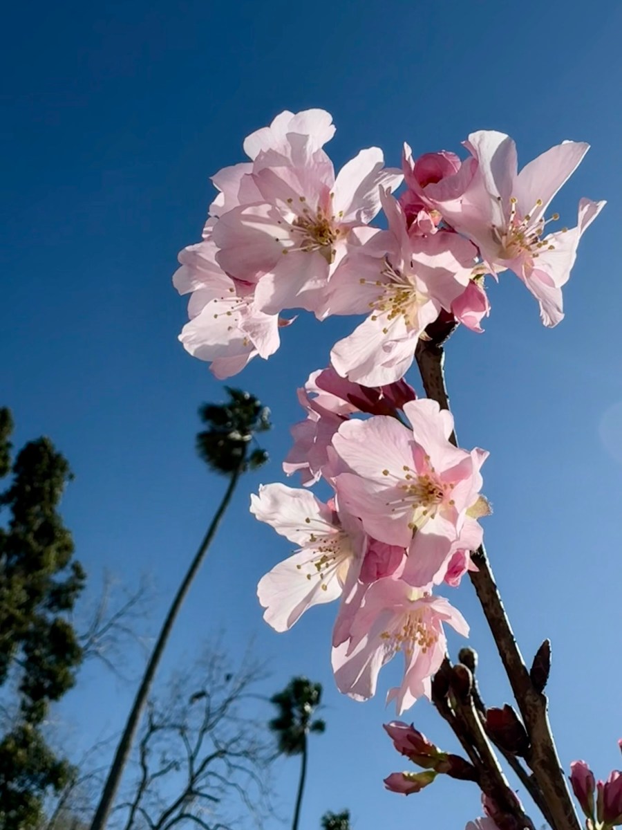 It is now sakura season in Kyoto, Japan. And unexpectedly, to me, sakura are blossoming at the same time here, far away across the Pacific Ocean in Los Angeles, where the tall palm trees are emblematic. Am I right to say that sakura will be the last thing to come to mind when thinking of LA? This city conjures three things: Hollywood, beaches, and palm tree lined boulevards. But quietly, sakura are here too, pink and light in this sprawling City of Angels.